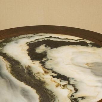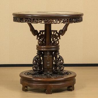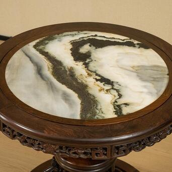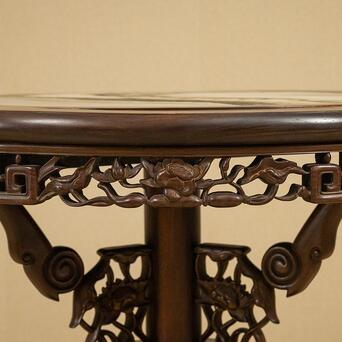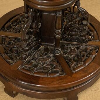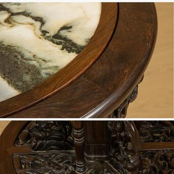 此百灵台造型典雅华贵,端庄古朴。甄选上等红木为材,包浆醇厚,木色温润,木质坚实,木纹清晰淡雅,顺直流畅。台面圆形,攒框镶云石面板,木与石不同的质地、色泽交相辉映,碰撞出别样的韵味。云石纹理奇幻诡谲,似云海渺渺,如层峦叠嶂,颇具意境。台面用料厚实,边抹圆浑,弧度自然。牙板透雕荷花纹,枝叶舒展卷翘,花瓣秀美柔婉,线条流畅圆润,蕴含着充盈的生命力。底座与台面间以粗壮的立柱做支撑,支架上部设挂牙,透雕有荷花纹,栩栩如生,令人不禁想起“接天莲叶无穷碧,映日荷花别样红”。下部站牙亦雕刻对应纹饰,另有三根立柱支撑,整体和谐统一,结构稳固。底座面以直枨间分六格,呈扇形分布,内部透雕荷花纹,空灵通透。下设束腰,牙板混面,底承六足,坚实稳固。