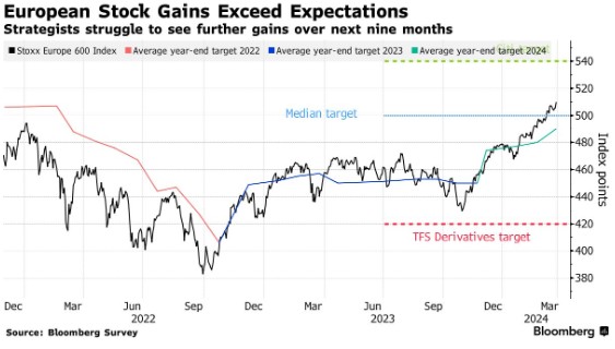 截至发稿,泛欧斯托克600指数下跌0.16%,该基准指数触及509点,根据对16位策略师的调查,相比该指数2024年末的预期中值高出约2%。